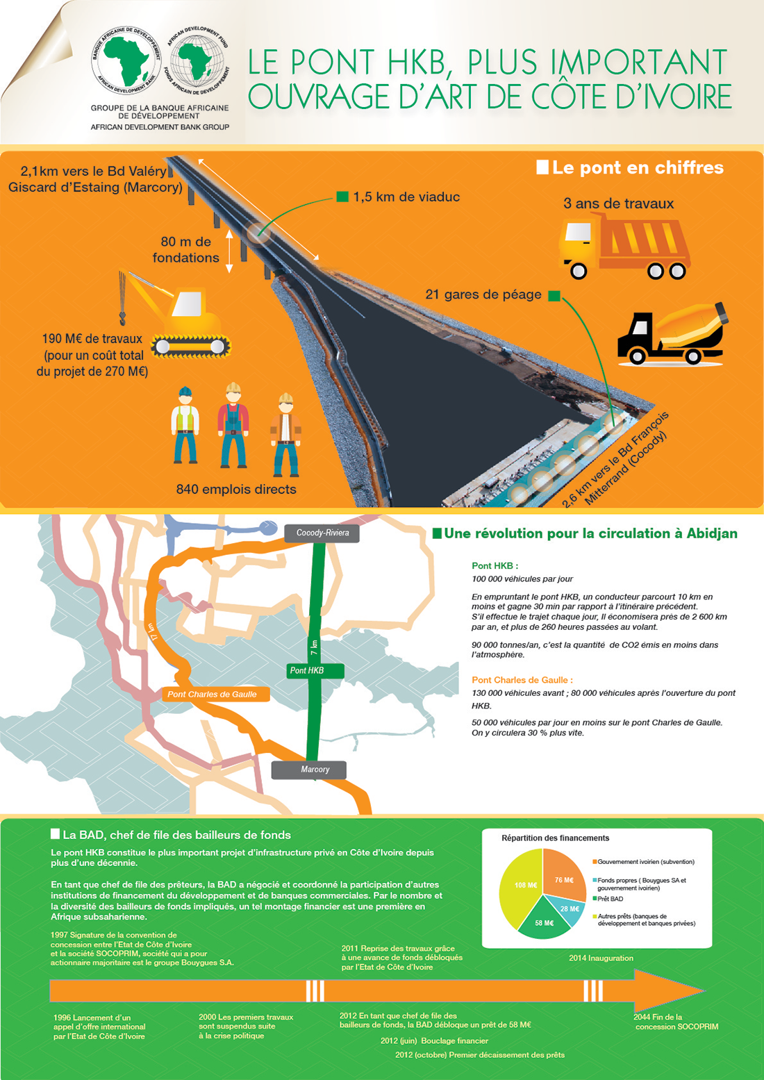 Le nouveau Pont “HKB” comme certains le surnomment – ou tout simplement “le troisième pont” – aura nécessité trois ans de travaux. Mais le projet est bien plus ancien, dans les cartons des plans d’urbanisme d’Abidjan dès 1952.Le temps passant, la ville n’a cessé de s’étendre et le trafic de se densifier, aiguisant davantage encore la nécessité de concrétiser le projet. Et c’est le 14 novembre 1997, que l’État de Côte d’Ivoire a signé une Convention de concession avec la société Socoprim, constituée pour l’occasion avec le groupe Bouygues pour actionnaire principal, lui confiant ainsi la construction et l’exploitation du futur ouvrage.