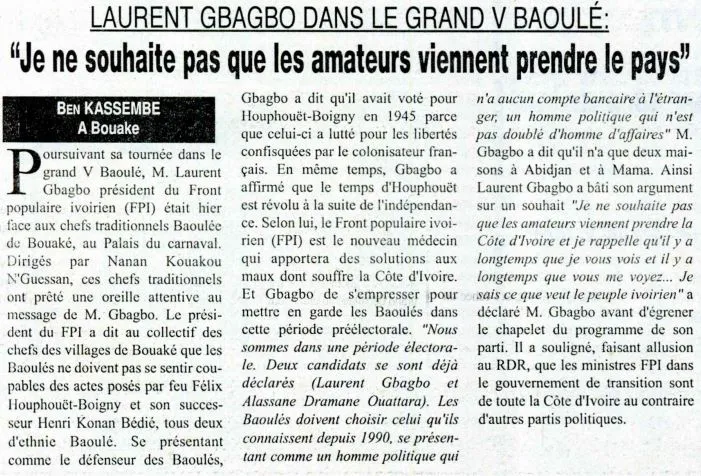 Se présentant comme le défenseur des Baoulés, Gbagbo a dit qu’il avait voté pour Houphouët-Boigny en 1945 parce que celui-ci a lutté pour les libertés confisquées par le colonisateur français. En même temps, Gbagbo a affirmé que le temps d’Houphouët est révolu à la suite de l’indépendance.