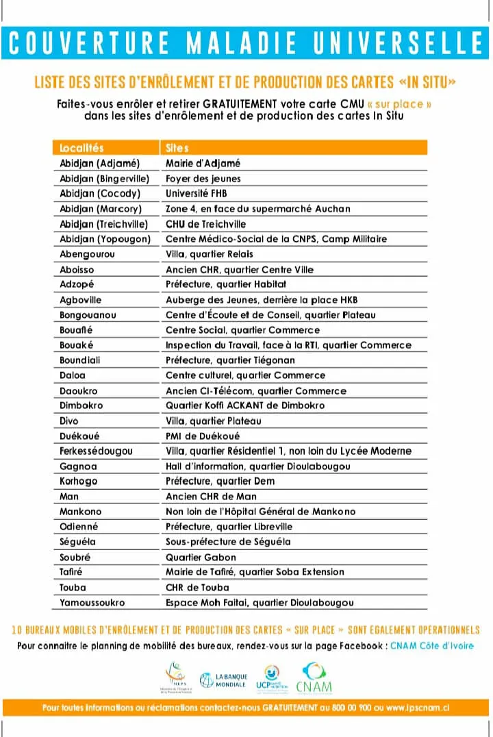 Dans le cadre de sa politique de vulgarisation de la Couverture Maladie Universelle (CMU), le ministère de l’Emploi et de la Protection sociale a rendu publique la liste complète des 30 sites d’enrôlement in situ répartis sur l’ensemble du territoire ivoirien.