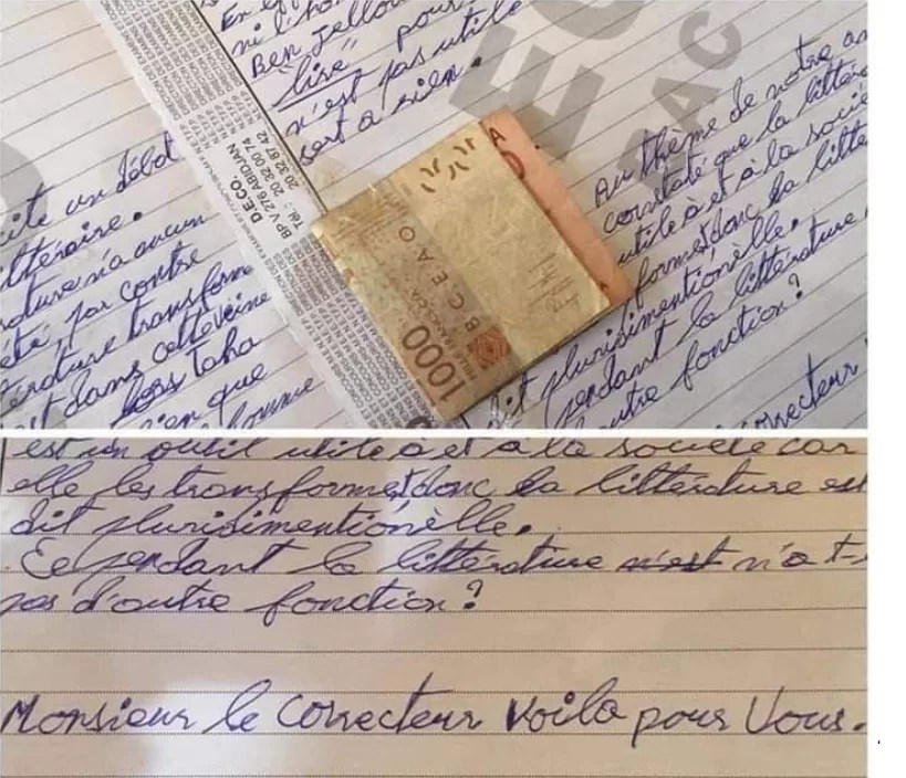 Si bon nombre de fraudeurs préfèrent utiliser ce que l’on a nommé les “réseaux” d’autres vont plus loin en demandant de l’aide aux correcteurs par la mise des billets de banque dans leurs feuilles de copie espérant que le correcteur leur donne de bonne note. Mais, cette technique a été dénoncée par ces professeurs correcteurs qui sont allés plus loin en publiant les photos de quelques feuilles de copie. Ci-dessous, nous vous offrons des images :